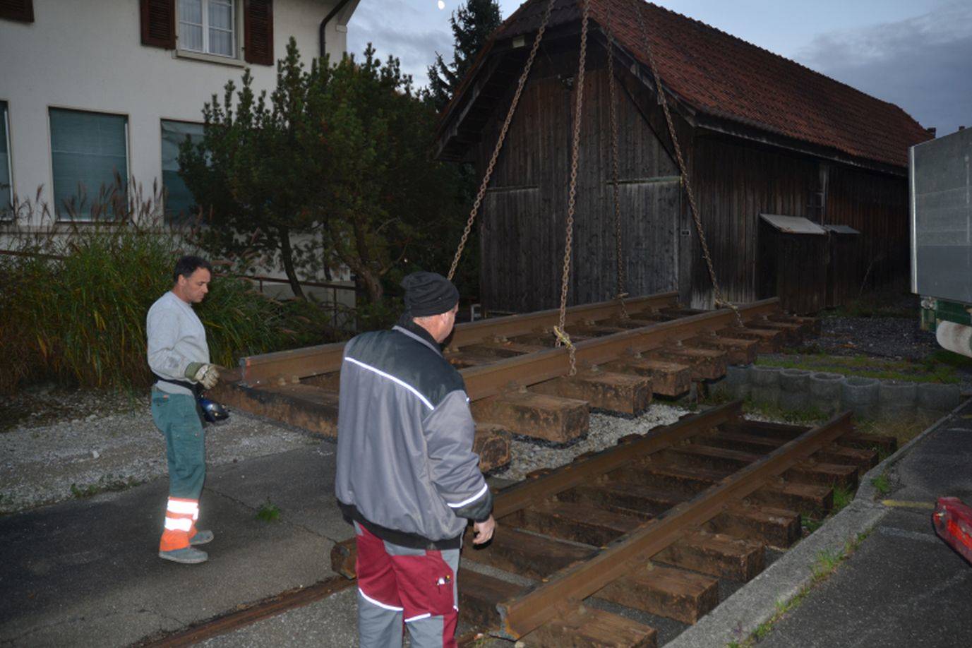 Vor der Remise werden 10 Meter Gleis wiedereingebaut. So kann das Melchnauerli zukünftig wieder aus der Remise gerollt werden, damit es der Oeffentlichkeit präsentiert werden kann, aber auch um besser an diesem arbeiten zu können.